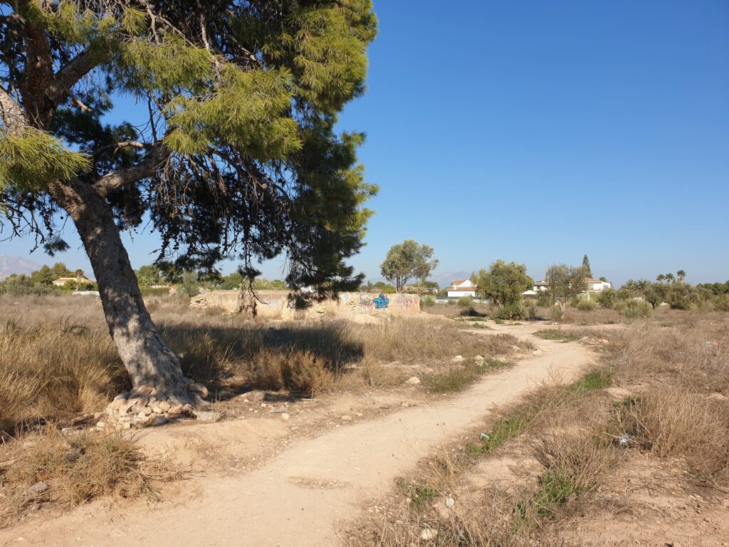 El camino pasa por algunos retales del tradicional secarral alicantino, áspero y polvoriento, hecho de antiguos bancales, depósitos de riego vacíos, árboles aislados y contrahechos, casas de campo ya sin cubierta ni ventanas, senderos espontáneos, vegetación pardusca y trocitos de plástico blanqueado por el sol.